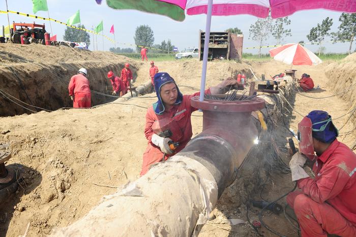 图为8月31日,中原油田管道施工人员正在对管道走向进行重新优化整改。