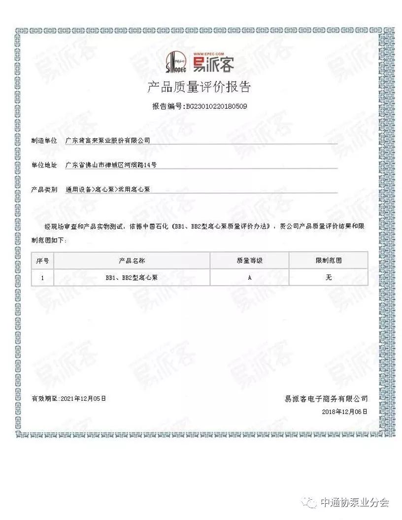 产品质量评价从资质等级、装备能力、质保体系、性能检测等方面,对产品给予专业评定。肯富来泵业BB1型离心泵凭借过硬的产品质量和优异的客户使用评价,同时经过中石化易派客相关专业技术人员和专家的现场严格审查和产品实物测试,荣获产品质量评价A级认证。