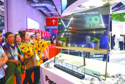 11月6日,首届中国国际进口博览会上观众在了解松下透明OLED电视,该电视关机时屏幕呈现透明状态。新华社发