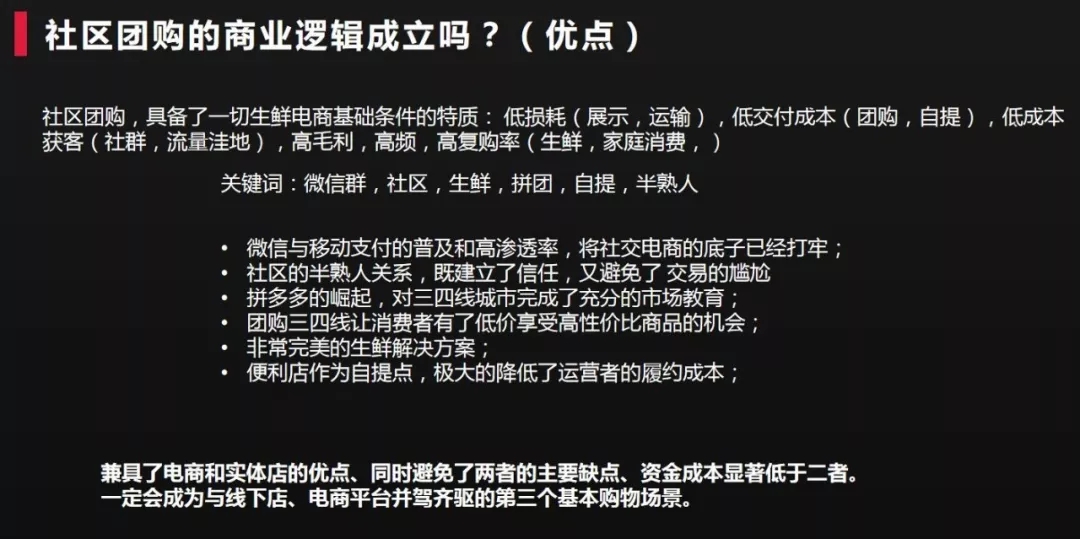 第一个是熟人关系,社区团购从来不是熟人关系,我说在中国熟人之间怎么做生意呢?在中国熟人是没法做生意的,做不出来好生意,什么生意好做呢?就是半熟人,同乡,发现突然有一个和你一个地方来的老乡,你的第一反应是什么?倍感亲切,这个社区的原因也就在这儿,都是一个社区的,所以说他天然能够解决掉的是陌生人的不信任感,同时又避免了熟人的尴尬,既是同乡,同时该怎么做生意就怎么做生意。第二个是搬运,整个生鲜搬运从产地到销地批发市场到社区,多次搬运成本是巨大的,很快颜色就会不好看了,所以过去生鲜的成本都卡在这里。第三个是配送,最后一公里配送成本是很高的,现在通过集中配送到团长那里,消费者自提,也就是说最后一公里没有太多的成本。整个中间环节运输的损耗和运输的成本已经被压缩到极低的概念,意味着生鲜的高毛利就会带来巨大的爆发潜力。