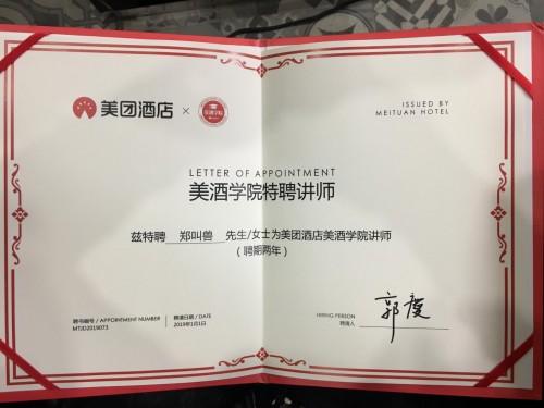 作为酒店与平台之间的一道重要沟通桥梁,美团网美酒学院十分重视酒店“互联网+”的人才培养,扶持了不少酒店管理人员健康成长。而2018年6月成立的郑叫兽美宿商学院与美团网美酒学院的核心理念不谋而合,建立了以下全方位的核心服务体系:酒店全方位诊断:产品、价格体系梳理,管家服务系统、线下好评转化机制导入,会员系统、积分制度设计,收益管理制度制定以及酒店专业岗位人才的培养输送。双方都将酒店行业的人才培训放在首位,把推动国内酒店行业发展作为己任。