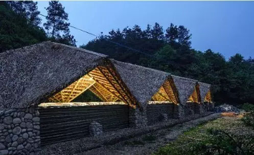 太阳公社是一个社会环保型的项目,建筑师以当地的材料毛竹构和溪坑卵石,建造了这间适于田间地头的茶棚猪圈,造价低廉,但是却易拆卸和重修。屋顶的毛竹结构的编织发动了当地所有村民。正如太阳公社的理想:“让每一颗在尘世中奔波的心有一个地方得到休息。”这个乡村里的乌托邦同样也是对手工艺的一次复兴。