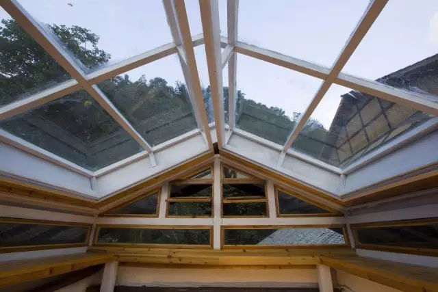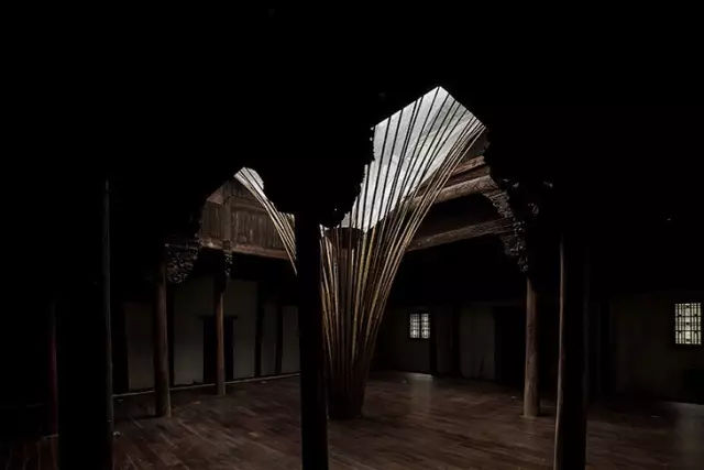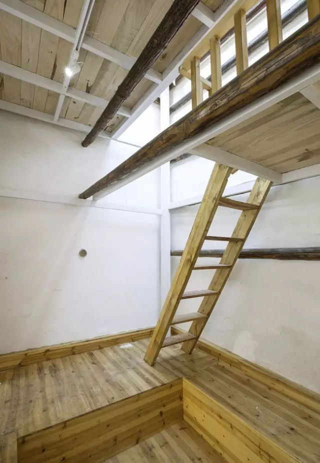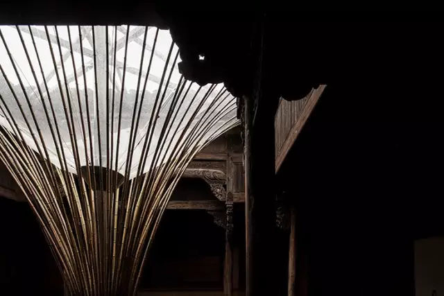 “走马楼”是一个四合院式的徽派老宅的移建,由于位置正处码头,因为被改造成为一个酒店的接待厅和酒廊。整个老宅的占地面积很小,天井就占了不少空间。在天井的局部可以开启一个“伞形”独立装置,来解决空调密闭性,雨水收集和采光通风等一些系列问题。“伞形”下方可以腾出更多空间放置沙发同是也可以让“雕梁画栋”更好的呈现。建筑师希望老的建筑能够尽量的被使用,但不是单纯的作为被“供奉”的对象。建筑师比喻:“这个和以前人们修补陶器后,一直把玩的道理一样。”