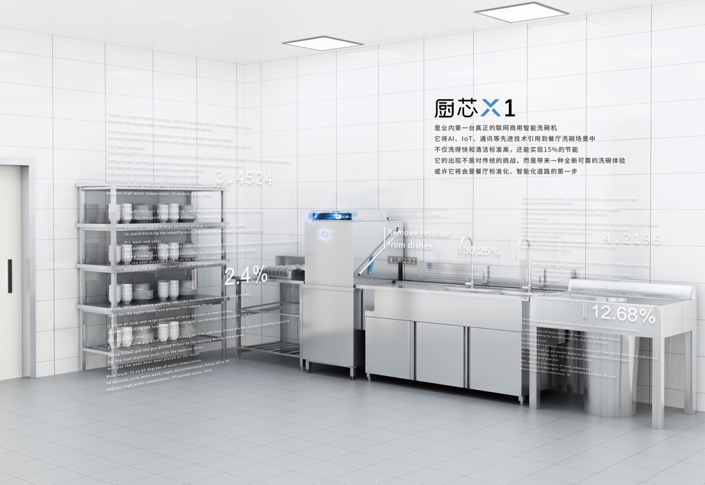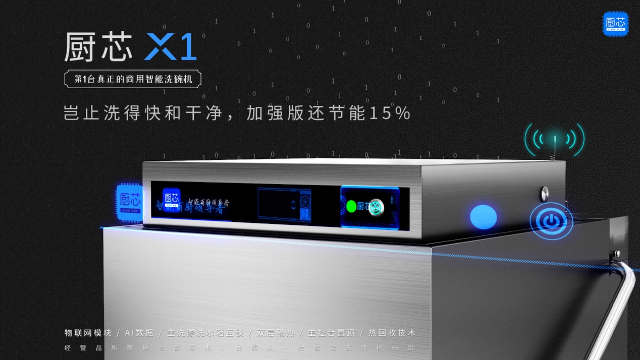 厨芯从成立至今,一直专注于商厨智能化领域。厨芯结合了传统商用洗碗机与物联网、人工智能和大数据技术等前沿技术,于2018年推出行业内第一款真正的联网智能商用洗碗机——厨芯X1智能洗碗机,它不但洗得快和干净,加强版还节能15%。