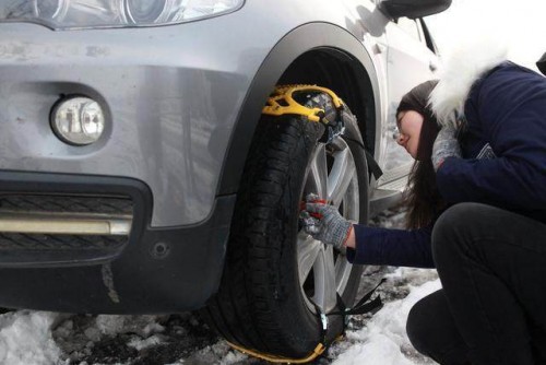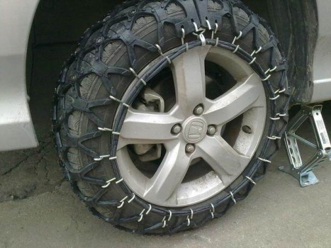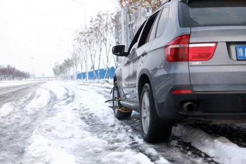 然后慢慢将车向前或向后移动一段距离。确定防滑链安置在轮胎上后,通过防滑链链环的两个对边把装置拴紧。最后慢慢启动车辆,通过车轮压地声音可以判断防滑链安装情况。
