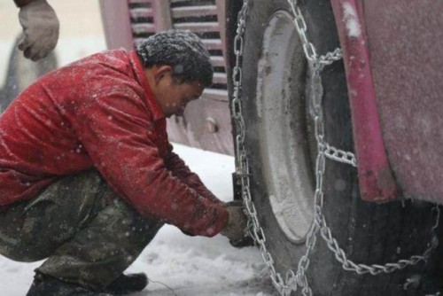汽车在冰雪道路上行驶,尤其是在山区道路,必须安装防滑链。下面十虎汽车用品先介绍防滑链的正确使用方法。首先,将防滑链在地下铺开,然后把每一个链的第一个锁扣扣在轮胎上。然后检查确认每一个轮胎是否都固定住了链条,每一面是否都搭接了一股齿轮。