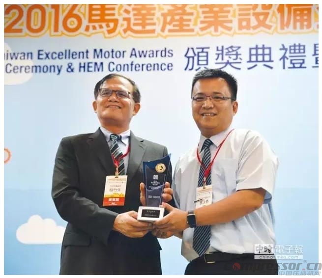 台湾工研院机械所长胡竹生(左)颁奖座给复盛公司产品经理张永泰(右)