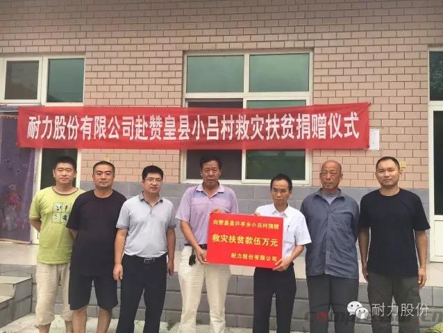 风雨同舟,情系灾区,自从洪水灾害以来。在这危难的时刻,耐力股份有限公司一直心系灾区,关注灾民,特为赞皇许亭乡小吕村进行爱心捐赠善款活动。2016年8月17日上午,耐力股份有限公司董事长陈文金一行人来到赞皇县许亭乡小吕村,代表耐力股份,捐赠5万元善款,帮助许亭乡小吕村灾后重建尽一份力量。