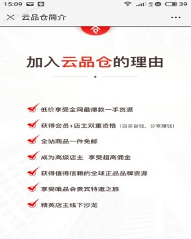 “云品仓”是唯品会近期上线的一个小程序,为个人卖家提供从商品、物流、客服到营销的各种服务,仅支持微信支付,完全依托微信生态,它是唯品会下全新的分销平台,可以帮助店主打造自己的微信小店。“云品仓”真正实现了让从消费者变成消费商,现在加入云品仓,各位店主就一定能抓住这波社交电商的早期红利。