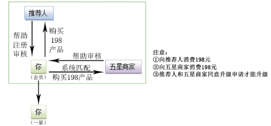 1、你在你的推荐人那里消费他的产品198元。他帮你注册成为鸿泰创客普通商家。然后系统推荐另一个五星商家审核你的资质,你在他那里消费198元。然后你的直接推荐商家和五星商家在审核升级那里点击同意你就成为一星商家,这时候你就拥有帮助别人注册的权限也就是卖自已的产品或服务,发展你的消费商市场。