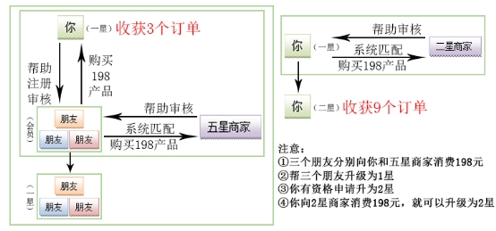 3、二星商家升三星商家,三星商家升四星商家是没有门槛的,直接提交申请找对应推荐的商家消费198元就可以升星了,升为三星商家您的消费商升三星商家就会找你消费,按基本三三发展规则商家就是27个,这27家商家升三星系统就推荐给您(只要你升到三星以上),您就可以收到27个消费商找你的消费,为什么您刚开始升为三星没有27个消费商找你,因为您的消费商暂时还没有升三星商家,您要做的就是服务好大家做好带动,等他们升的时候自然会找你,同样的原理,以此类推到四星商家。
