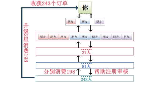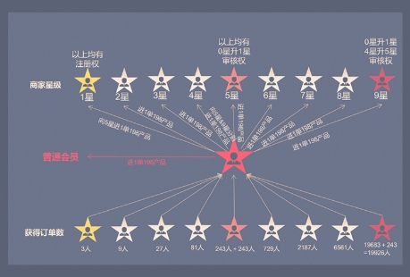 4、四星商家升级五星商家是有条件的,那就是你发展商家总计有81个一星或者是一星以上的商家,您再提交申请,系统会按规则推荐一个五星商家,另一个是您所在商圈的九星商家,那您就是五星商家了,当您通过努力升为五星商家(相当于你发展的消费商进来时都要找你消费一次),您就像开了排队购买的超市,从此您的销售源源不断,您就真正开始偿到努力发展市场的甜头,假设今天您下面进来10个一星商家,您就会收到10个消费订单,一个订单回款198元,您一天的收入就是1980元,这种自动收单收钱,颠覆了传统销售的固有思维!您升到五星商家时会有243个消费商,这243人升星都要找你审核消费一单,您就可以最少收到243个订单 。