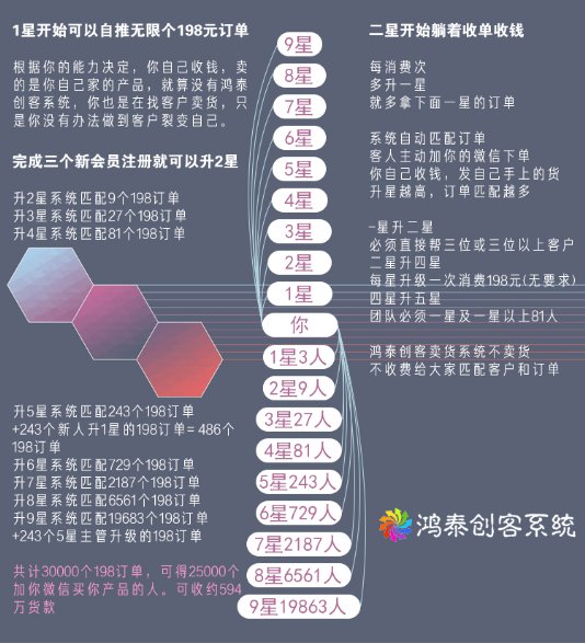 7 、当您发展的消费商找你升三星时,升六星时,如您连三星或六星都不是,那系统就会自动往上找商家,所以您就会错过商机!如果真的把鸿泰创客系统工具用好,那么当您达标二星后就不要停,赶快一口气升级到四星,随时关注您的团队显示的消费商数量,达到81个一星商家或者是一星以上的商家时,您要做的就是一口气升到九星商家,九星商家的好处就是您的团队所有消费商升级五星时系统就会推荐给您,开启各种排队人脉订单,让我们所有商家在九星顶峰相聚。上天不会辜负奋斗者!加油鸿泰创客!!