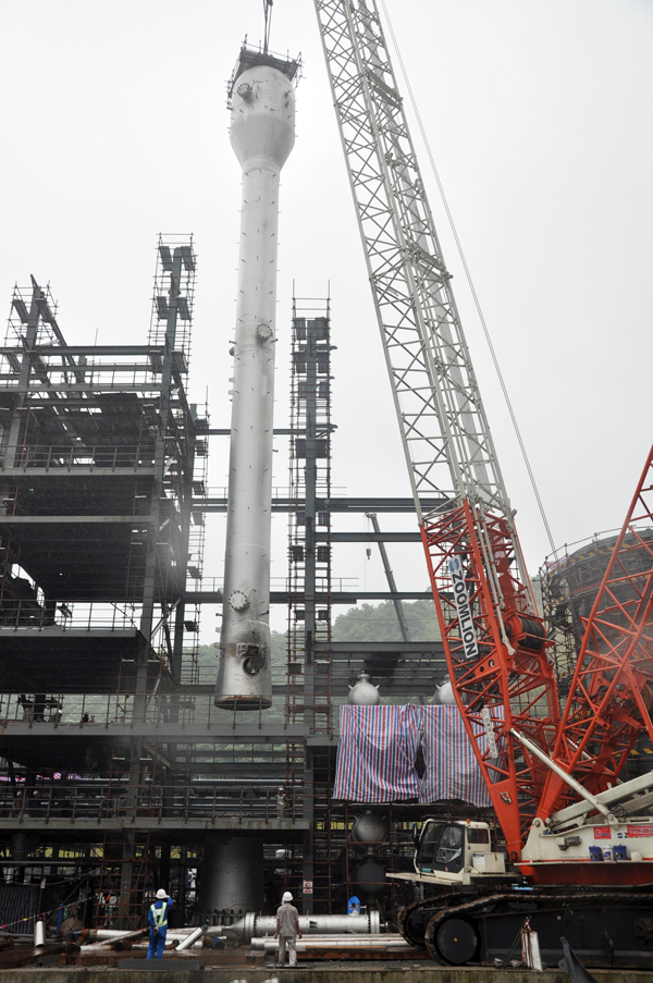 脱硫反应器是szorb装置核心设备,单体重量最大、高度最高、安装难度最大的一台立式设备,总重160吨、总高42.731米、分两段到货吊装。吊装前,五建岳阳项目部结合理论数据编制详细吊装方案,成立吊装小组,确保一次吊装到位。吊装采用400吨履带吊主吊,提升反应器顶部,150吨履带吊溜尾,两台吊车配合递送。随着指挥命令哨响,起吊作业缓缓进行,反应器逐渐由平卧状态过渡到竖直状态,反应器直立后,溜尾吊车脱钩,400吨吊车回转入反再框架预留一侧,行走至反应器正上方,反应器一次吊装成功,随后进行下道工序设备组焊。吊装一次到位,得到了业主和现场监理的一致好评。