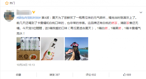 正是由于人们越来越倾向于无糖饮料的偏好,才使得元気森林的产品一经上市便迅速占领其他饮品极少涉及的无糖领域,掀起“无糖轻饮”的新热潮。从市场热度来看,元気森林的高颜值无糖茶饮料品牌成功晋升为新一届宠儿,旗下黑白燃茶、果茶系列产品频频出现在微博、小红书、抖音等网络平台上,线下市场也同时被“点燃”,甚至有许多明星也成为了燃茶的忠实用户,产品销量持续上涨。
