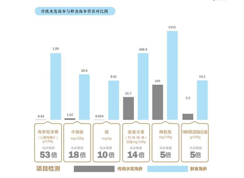结果显示,像对人体有极佳的抗血栓,抗肿瘤,降血脂等作用的海参粗多糖,鲜食海参含量足足是传统水发海参的53倍;增强人体免疫力,防止心血管病,促进婴幼儿脑组织和智力发育的牛磺酸是传统水发海参的18倍,人体每天必须摄入的微量元素14倍;卓越抗癌,抗氧化作用的硒10倍,精氨酸、18种氨基酸的含量是传统水发海参的5倍之多。