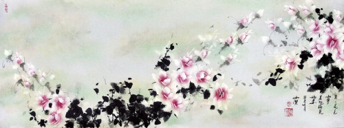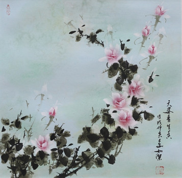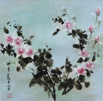 反观如洁先生创建法门,却是文人改画月季的新动向。像如洁这种有修养,有品格,重品质的文人画家,不愿意再与俗笔同流火写牡丹,而是另辟他门独倾月季。他用破墨破彩之法,独创性地用湿画法把月季花的肉感与馨质表现得独显法能。水破墨,墨破彩,经由水的调节,墨生五彩辉,浓淡干湿焦,无所不用至极,大道至简,幻化无穷。把自然状态下的月季,绘意成悦目赏心的天工。普通月季被引绘画里,竟然是如此的神韵!色韵铺陈,则主显艳雅,虽是重彩,可同样是趋雅奔儒,绝对不会因为大彩的铺陈渲染而传递出一丝一毫的风尘味,和大火质,绝然是天工神来的奇观逸品,月季花在他精心写意的酝酿中,成为百花之中的仙子派,也是画题重构的君子风。他用独树一帜的笔墨精彩,赋予月季花新的文化品位和修养格调,滋润鲜活、清新素雅、馨香和谐,性灵通神,韵悠无穷!