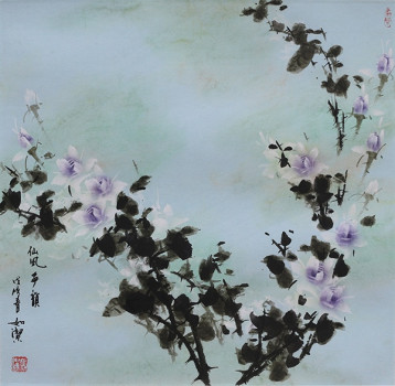 在创作中,把中国绘画传统技法与西画技法相结合,运用“湿画法”,将彩、墨、虚、实、远、近关系融入作品,使作品呈现出滋润鲜活、清新、素雅、和谐的自然效果,使享誉世界“花中皇后”之美誉的月季花,气质更加凝重,典雅、温馨而充满生机。