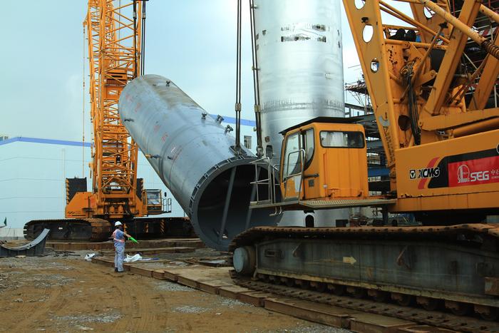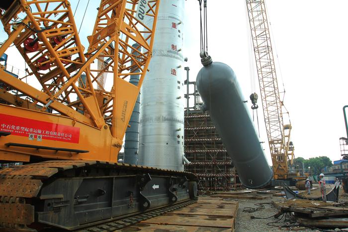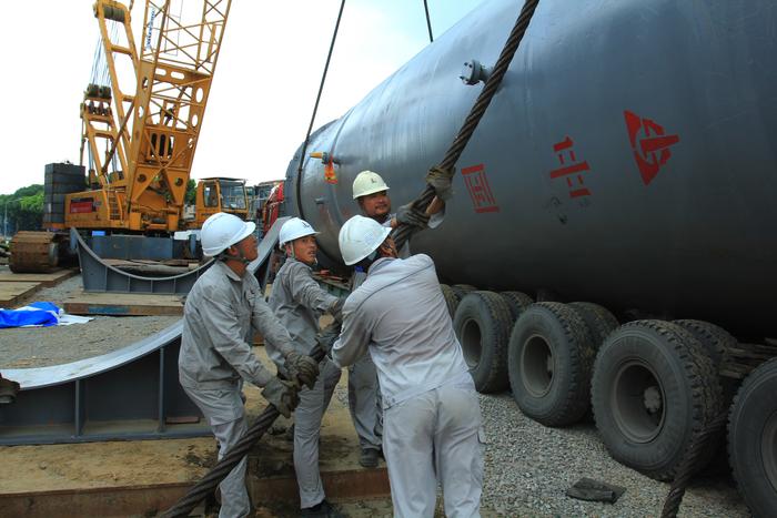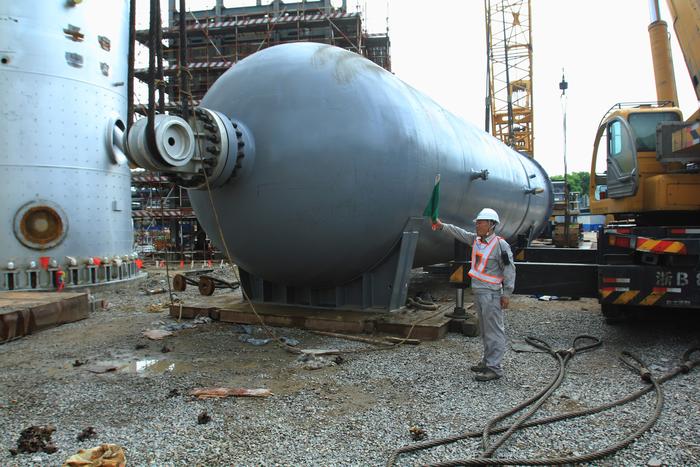 7月12日下午,重143﹒5吨、高16﹒7米的镇海炼化300万吨/年柴油加氢项目热高压分离器成功吊装到位,至此,由炼化工程集团宁波工程公司承建的该油品质量升级项目,其80吨以上非标设备安装暂告段落。 据了解,截至目前,该项目已安装完成非标设备17台,安装总重量超过千吨。根据施工计划安排,8月份,该项目建设将迎来第二波的设备安装高峰。