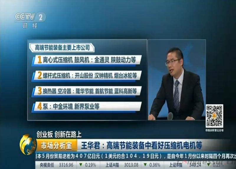 6月21日,国家发展改革委、工业和信息化部、国家能源局三部联合印发《中国制造2025—能源装备实施方案》通知;同一时间,中央CCTV2套晚间《市场分析室》栏目聚焦高端节能装备,邀请中国银河证券研究部执行总经理、机械军工行业首席分析师王华君,对包括压缩机在内的高端节能装备进行了分析,可以看出,其市场前景十分广阔。