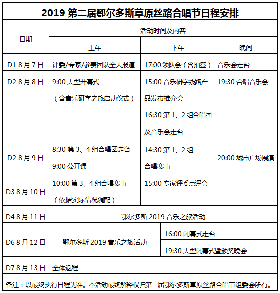 为加强鄂尔多斯文化和旅游深度融合发展,加快鄂尔多斯全域旅游繁荣发展,践行党中央关于“要牢牢把握社会主义先进文化前进方向,坚持以人民为中心的工作导向”的指示精神,整合“天骄圣地、大漠风光、民族风情和休闲避暑”四大主题旅游产品品牌影响力;通过草原丝路合唱节的举办推动西部地区及全国合唱艺术的发展与提高,推动鄂尔多斯音乐之旅特色旅游品牌建设,着力打造“鄂尔多斯草原丝路?歌的海洋合唱基地”特色品牌、鄂尔多斯音乐旅游季、音乐小镇、音乐客栈等音乐休闲旅游产品体系建设,向世界传递鄂尔多斯音乐之旅休闲旅游目的地品牌,更好的传承中华优秀文化,践行社会主义核心价值观,为美丽中国梦做新贡献。中国合唱协会与鄂尔多斯市人民政府特定于2019年8月7日—8月12日举办2019第二届鄂尔多斯草原丝路合唱节,具体内容通知如下。