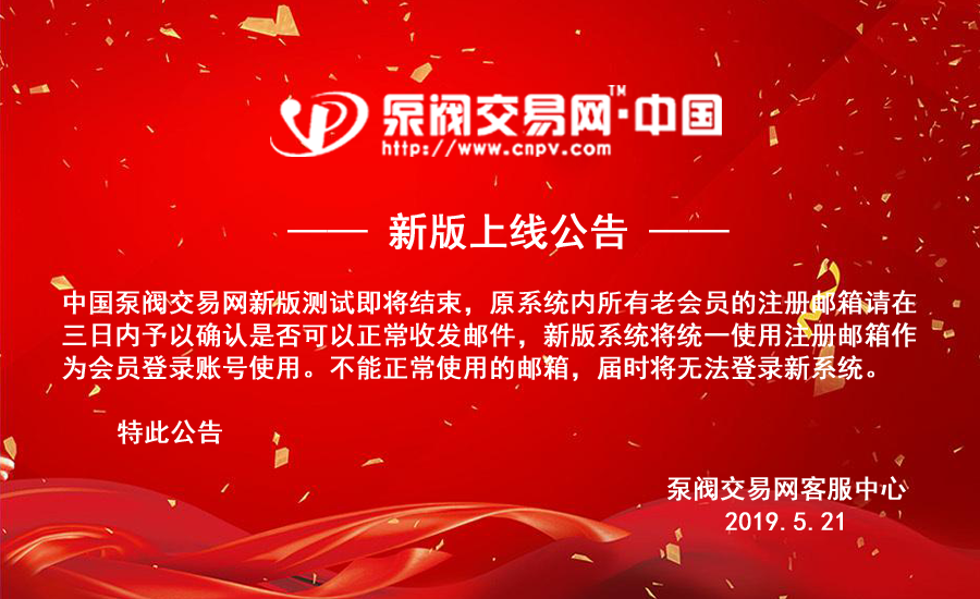 泵阀交易网·中国(2019)新版测试即将结束,原系统内所有老会员的注册邮箱请在三日内予以确认是否可以正常收发邮件,新版系统将统一使用注册邮箱作为会员登录账号使用。不能正常使用的邮箱,届时将无法登录新系统。