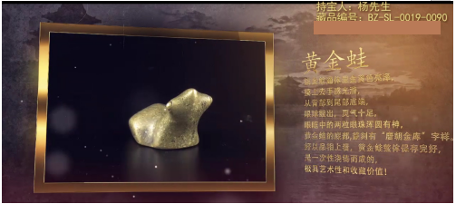丝路卫视《丝路风云》栏目第一期于2019年6月1日20点播出。本次亮相的民间珍品一共有五件:黃賓虹的山水畫、張大千的瓔珞仕女圖、宣德年制的鳳眼雙耳三足爐、唐朝金庫的黃金蛙以及雙耳喜字青花纏枝蓮紋賞瓶。