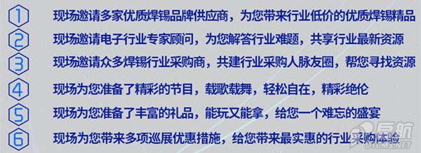为了更好地帮助采购商了解焊锡团购活动和产品,帮助供应商更好地宣传自身产品优势和价格优势,本次活动现场提供供采匹配一对一的交流机会。现场将会发放供采大礼包,内含价值1000元的焊锡采购优惠券!