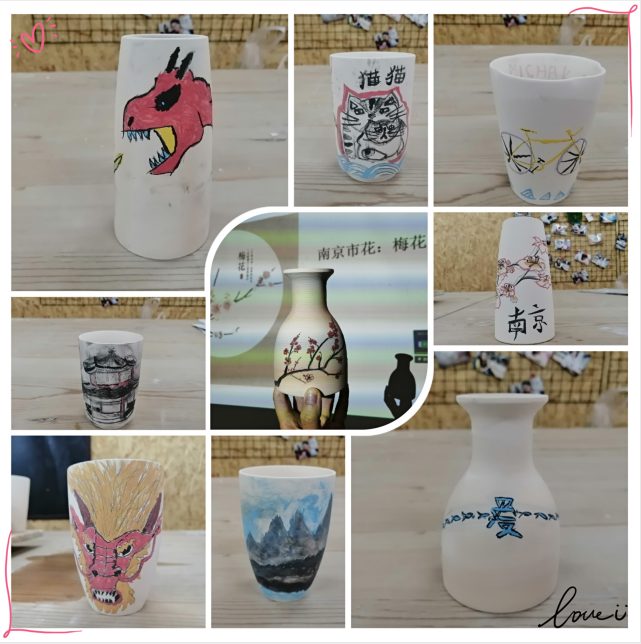 大家饶有兴致地在各种器皿上画了中国龙、南京市花梅花、古代凉亭、老山,还有的写了“爱”、“猫”的中国字,甚至还有的人画了浦口水墨大埝的自行车……看着这些由自己一笔一划勾勒出的作品,大家觉得十分满意。
