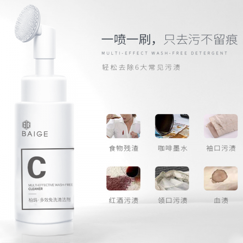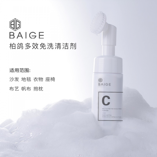 柏鸽多效免洗清洁剂在清洁衣服的时候,清洁剂中的表面活性剂分子会强烈地降低水的表面张力,并能够快速地将污垢润湿,润湿后的污垢会膨胀,纤维同时也会湿润膨胀,在膨胀的过程中,污垢与纤维之间的结合力就会降低,借助物理外力的作用,表面活性剂分子会吸附在纤维表面,迫使污垢与纤维分离,在润湿和外力的双重作用下分离下来的污垢会分解为更小的微粒,表面活性剂分子同时会包围污垢微粒,浮于水中,随着洗涤的泡沫带出衣物外。