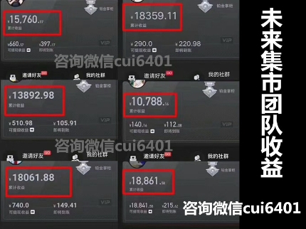 未来集市最大的亮点是我们可以通过这个APP平台创业,因为成为店主后就可以分享商品赚钱,也可以通过邀请店主加入来赚佣金提成,回报还是非常不错的,现在项目刚启动 加入正是好时候 能让你在风口上赚一把 ,想加入的咨询微信 cui6401 带你一起飞。官方一手资源。未来集市高层团队。