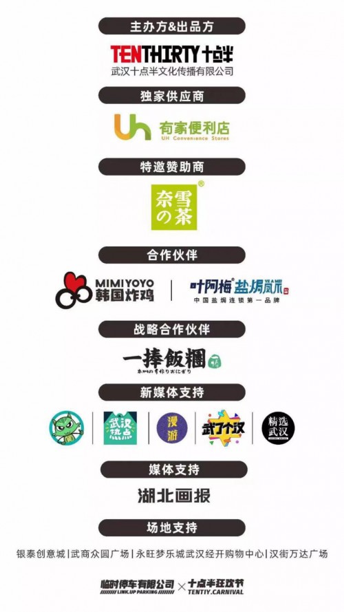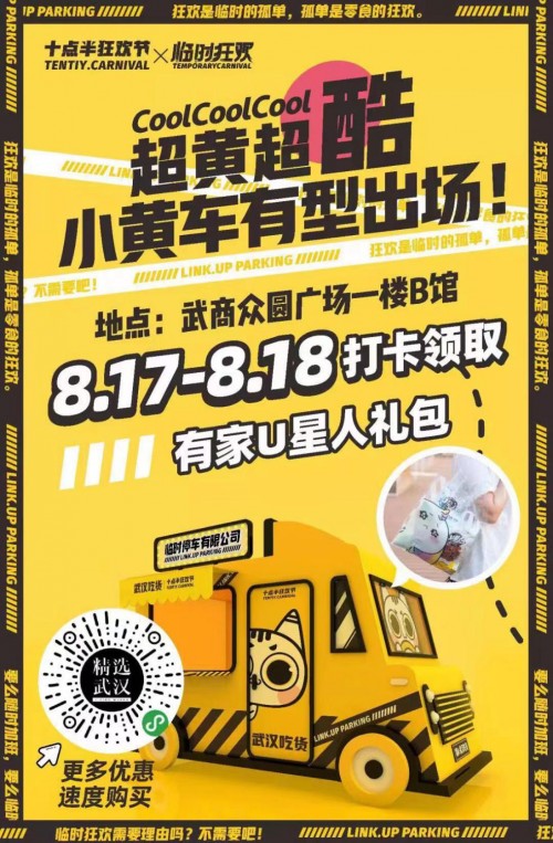 这是武汉十点半文化传播有限公司在2019年8月9月档推出一项以“临时狂欢”为主题,新媒体线上传播造势与线下原创IP“临时停车有限公司”联动的夏季狂欢主题活动。武汉十点半旗下“武汉吃货”“武了个汉”等城市自媒体集体发声,联合商业体内100+品牌商户玩转精选武汉电商小程序,与有家便利店、奈雪的茶、MIMIYOYO韩国炸鸡、叶阿梅盐焗凤爪、湖北画报等多家品牌临时合作,在银泰创意城、武商众圆广场、永旺梦乐城(武汉经开)和汉街万达广场四大核心商业体进行为期一个月的“临时停车有限公司”周末巡展活动,一共免费发放8800份礼包回馈粉丝。