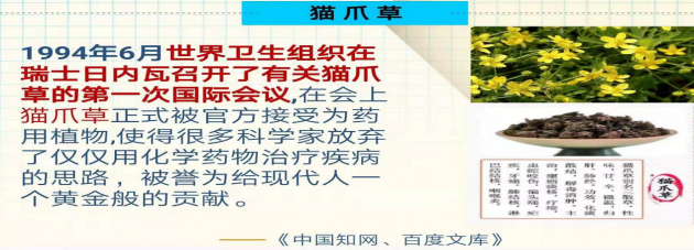 1994 年6 月世界卫生组织在瑞士日内瓦召开了有关猫爪草的第一次国际会议,在会上猫爪草正式被官方接受为药用植物,被誉为给现代人一个黄金般的贡献。大量的对这一威力极大的草本植物所作的研究,使得许多科学家放弃了仅仅使用化学药物治疗疾病的思路。