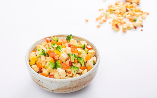 溯食粮采用航天技术—玻态冻干技术,能更大限度地保留食材本身的营养价值,同等规格的产品,比膨化工艺生产产品的营养价值高很多,这也是溯食粮的最大优势。20g溯食粮复水能够实现5倍还原,而普通宠物粮要达到相同营养价值大概需要100120g的产品。