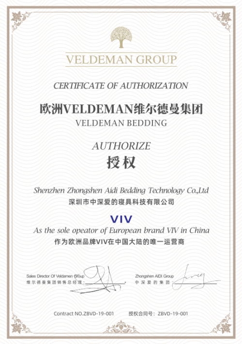 同时,此次Veldeman集团与深圳中比卫达科技睡眠公司举办了签约发布会,是VIV在亚太市场迈出重要的一步。作为欧洲最系统、最前沿的整体睡眠系统制造商之一的Veldeman集团,旗下拥有众多品牌,包含VELDA、VIV、GLOCOM、FYLDS'、VVIF、DUCAL、ONEA、Finesse、CREEN FIELD等多个寝室品牌,囊括弹簧床架、床垫、排骨架、固定床或可调整式床系统等多个寝具品类;然现由深圳市中比卫达科技睡眠有限公司负责Veldeman集团旗下众多品牌的亚太地区授权。