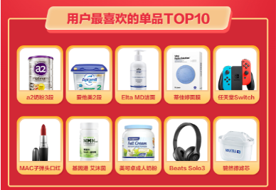 本次海囤全球日中,在用户下单top10的单品榜单中,a2奶粉3段引领风骚,爱他美2段紧跟其后,还有Elta MD洁面、蒂佳婷面膜、任天堂switch、MAC子弹头口红等产品也荣膺消费者最爱。