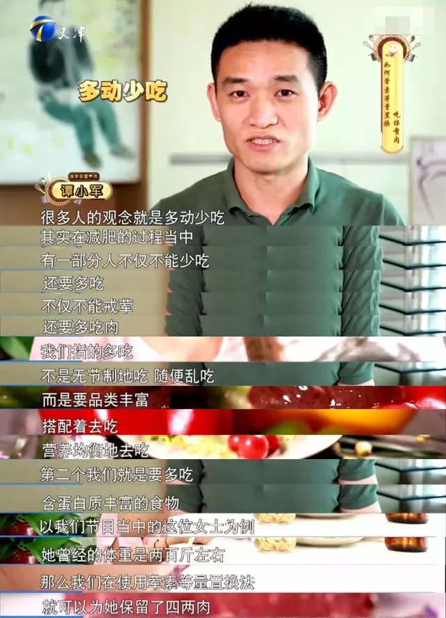 谭老师在节目中还详细介绍了如何使用“荤素等量置换法”将肉替换成别的食物。换句话说,不想吃猪肉的,可以按照比例换算成别的食物来吃,这样可以满足减肥人群对食物多样性的需要。