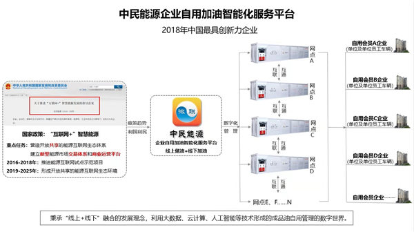 有鉴于此,中民能源(江苏)有限公司审时度势,于2016年创建了“企业自用加油智能化服务平台”。历经三年多的实践,并由中国创推委相关专家学者的论证,中民能源“与油为伴”的智能化服务平台,让会员单位享受到了批油自用的合法权益,降低了终端消费者的用油成本,又保证了国家税收不流失;与此同时,企业对能源的义务储备,还增加了国家能源安全战略储备,符合国家产业政策。