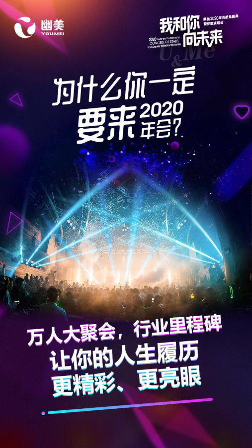 万人的盛大规模,震撼的舞台设计,重磅的明星阵容,“我和你?向未来”幽美2020年终感恩盛典——暨群星演唱会期待你的光临!