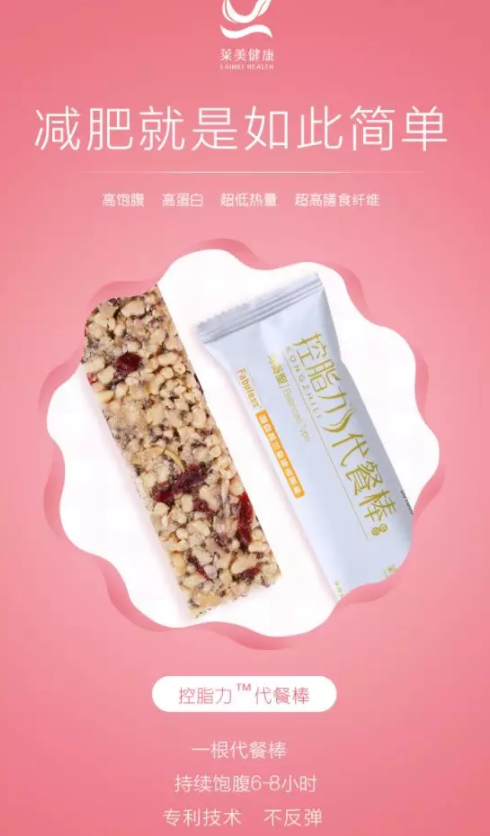 但是对于更多胖友来说 代餐棒依旧是一个“神秘”的减肥方式 它到底科学吗?代餐等于节食吗? 今天小编就来为你们揭开代餐棒的神秘面纱 一一解答你对它的所有疑问 控脂力代餐棒究竟是什么? 用来代替正餐的食物,同时热量又比正餐的热量更低,但依然能保证较为全面的营养元素,并且提供足够的饱腹感。因此胖友们可以通过代餐来减少每天的热量摄入,达到减肥的效果。代餐可以说是健康又营养的减肥“利器”啦!