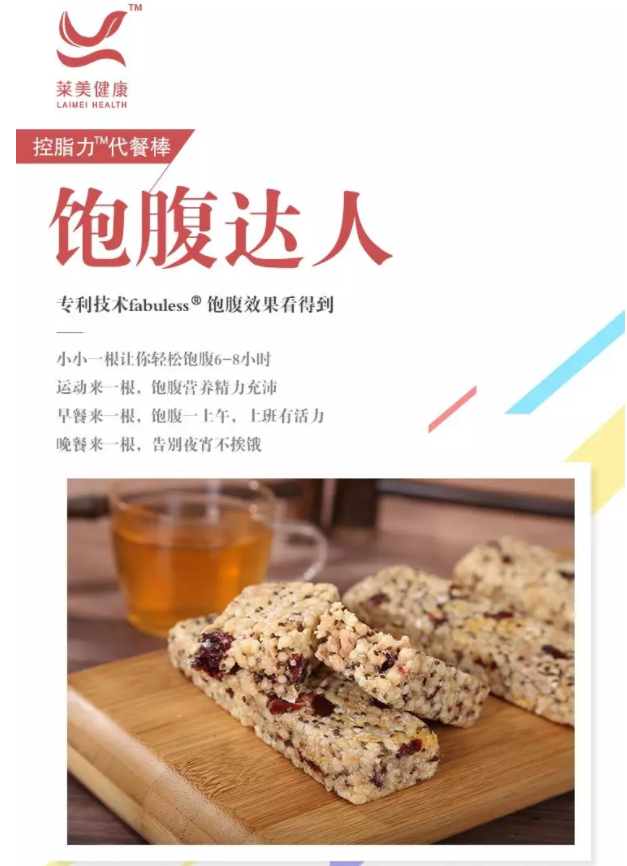 代餐是不是也算节食呢? 当然不算啦! 节食是“挨饿”,是在一段时间内大量减少热量的摄入,从而达到减肥的目的,容易导致体内缺少充足的营养来维持正常代谢;同时,身体得不到充足营养,就会自动开启 “节能模式”促使身体减少热量消耗,脂肪也就更容易囤积。 而控脂力代餐棒虽然比普通正餐的热量低,但并非低于人体的基本需求,并能确保为人体充分提供所需的蛋白质、维生素、矿物质及人体必需营养元素,除此之外,还包括了钙、铁等其它直接参与身体脂肪代谢的营养素,让你健康地瘦下来,于此同时也不用挨饿绝食,控脂力代餐棒中添加的有专利技术fabuless,饱腹时间长达68小时,饱腹效果相当于三碗米饭,但是热量却只有106大卡,相当于一个寿司。
