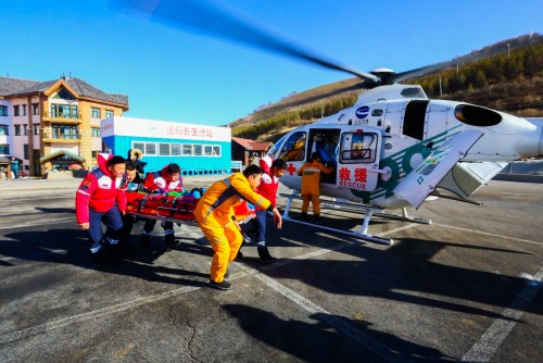 模拟场景一:直升机救援。比赛现场运动员在雪道受伤,经地面初步探诊,发现运动员伤情严重,地形复杂,地面救援难度大,呼叫长绳救援直升机转运患者至雪场运动员医疗站。待命直升机飞抵现场,悬停在伤员搁置点上空,下放钢索,在地面救援人员的协助下,将伤者抬进担架并做好悬吊链接。直升机回收钢索,把伤员运到医疗站,伤者经诊疗后需进一步转运治疗。待命执行转运任务的医疗救援直升机降落在医疗站,搭载伤者转运至最近的定点医院。
