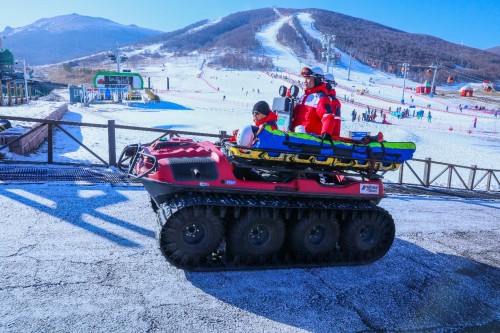 模拟场景二:雪道救援。比赛现场运动员在雪道受伤,经地面初步探诊,发现运动员上肢骨折。呼叫雪道救援队转运患者至雪场运动员医疗站,待命的雪道救援队立即进行救援,雪地摩托抵达伤员位置,救援队员将伤者固定到雪地摩托上,雪地摩托车把伤员运出赛道与现场救护车完成伤员交接,救护车把伤员运到医疗站,伤者经诊疗后需进一步转运治疗。待命执行转运任务的救护车将伤者转运至最近的定点医院。