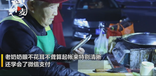 有食客买完煎饼后进行手机支付,老人也偶尔拿起手机查看,虽然已经是94岁的高龄,但是她眼不花耳不聋,算起账来很清晰。