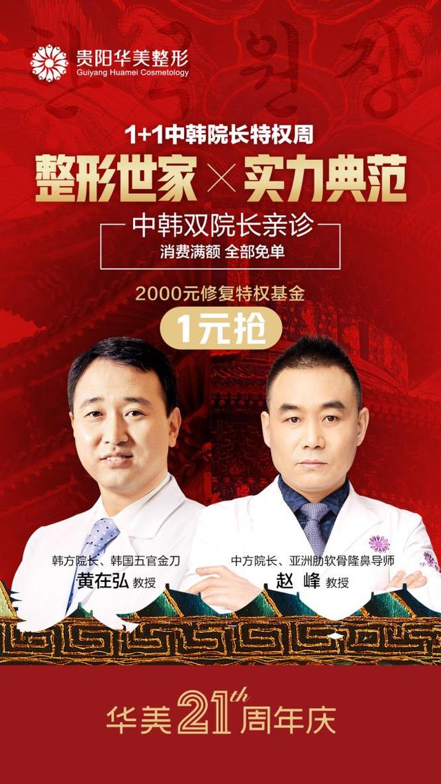 引语:中国鼻修复整形学科带头人、亚洲肋软骨鼻整形导师赵峰和手术以精细著称、韩国最会用刀的人黄在弘领衔华美史诗级整形专家天团,在贵阳华美周年庆期间,联合会诊,特权放利,成为西南地区行业盛事。