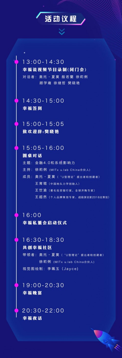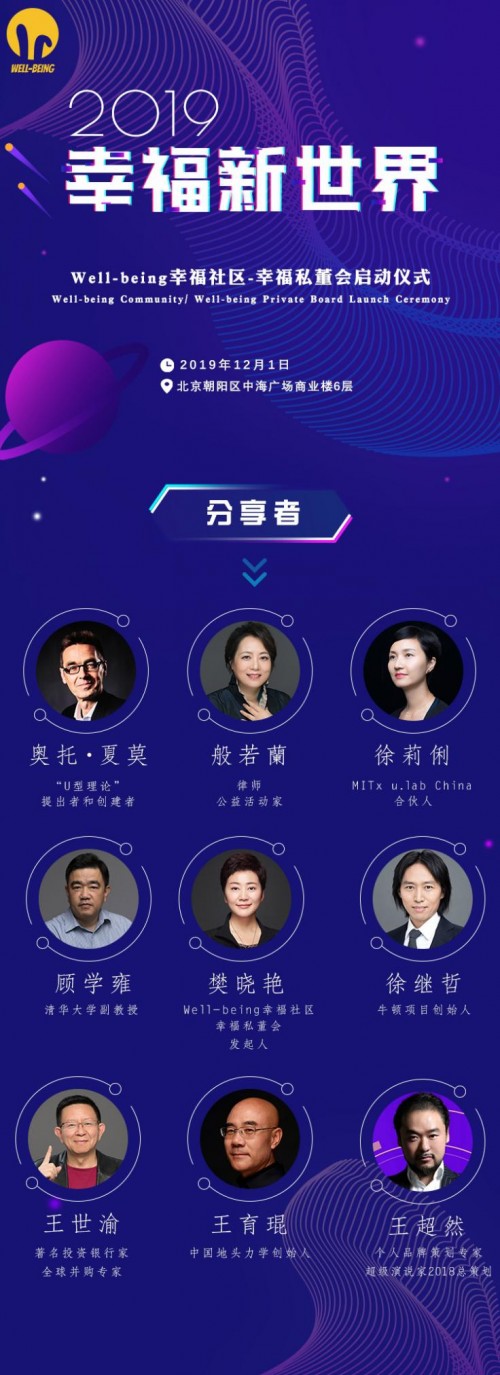 2019年12月1日,由幸福社、MITx u.lab China、看见幸福、聚民惠发起的主题为“幸福新世界”论坛暨Wellbeing幸福社区·幸福私董会启动仪式将于北京CBD中海广场商业楼6层隆重举行。