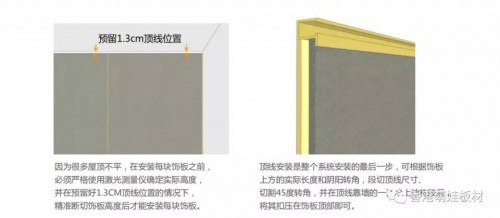 由墙面居中开始,分别向左右两 侧整块安装,安装到两侧最后一块饰板时,可根据实际到边距离修正饰板 尺寸后安装:先用激光测量仪在墙面找出中垂 线,安装第一块饰板后在饰板的两侧 插入中缝线,在中缝线上打钉固定, 参照第一种饰板的安装方法,依次安 装两侧的饰板。