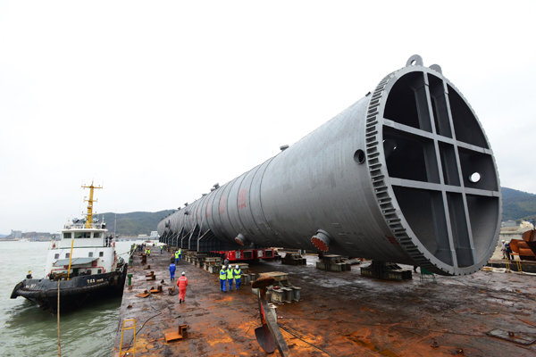 ??????? 1月5日,炼化工程集团宁波工程公司承制的目前亚洲整体制造、整体运输的最大塔器——制造加工总重量2300吨、设备长120米余、设备内直径8.8米的中海油惠州炼油二期项目100万吨/年乙烯装置丙烯塔整体制造完成,并成功装船交付业主。这也是炼化工程集团宁波工程有限公司迄今为止完成整体制造、整体运输的最重一台特大型炼油装置非标设备,再次刷新了该公司非标设备的整体制造、整体运输纪录。