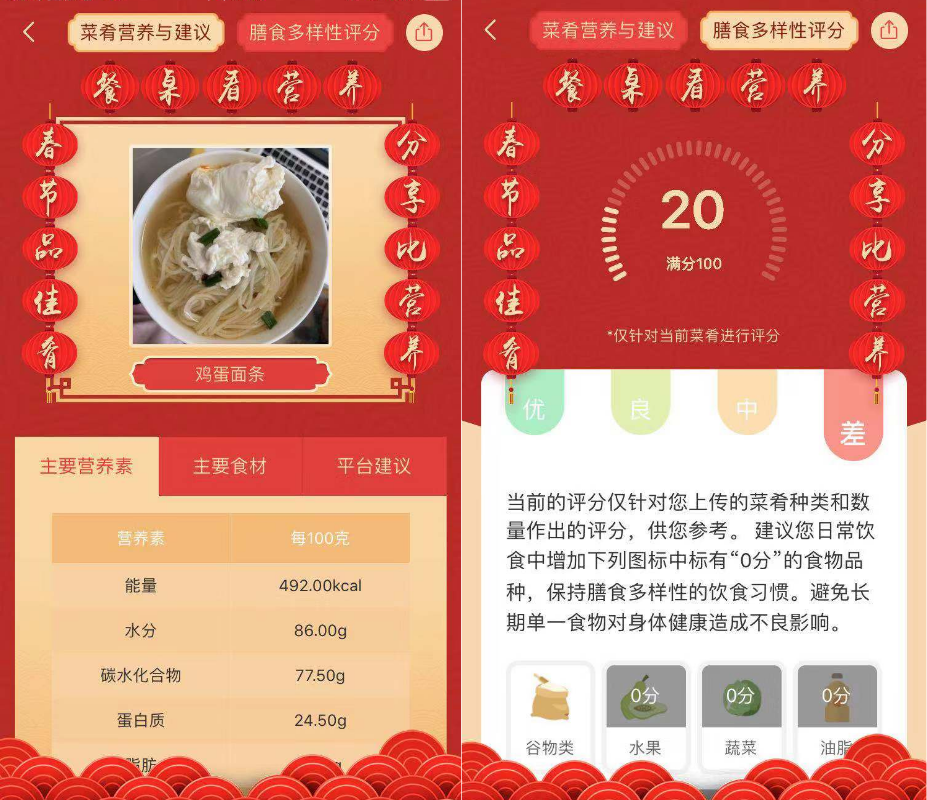 “餐桌看营养”功能基于《中国居民膳食指南(2016)》提出的平衡膳食模式,从食物多样性原则出发,对餐桌食物进行膳食多样性评分。