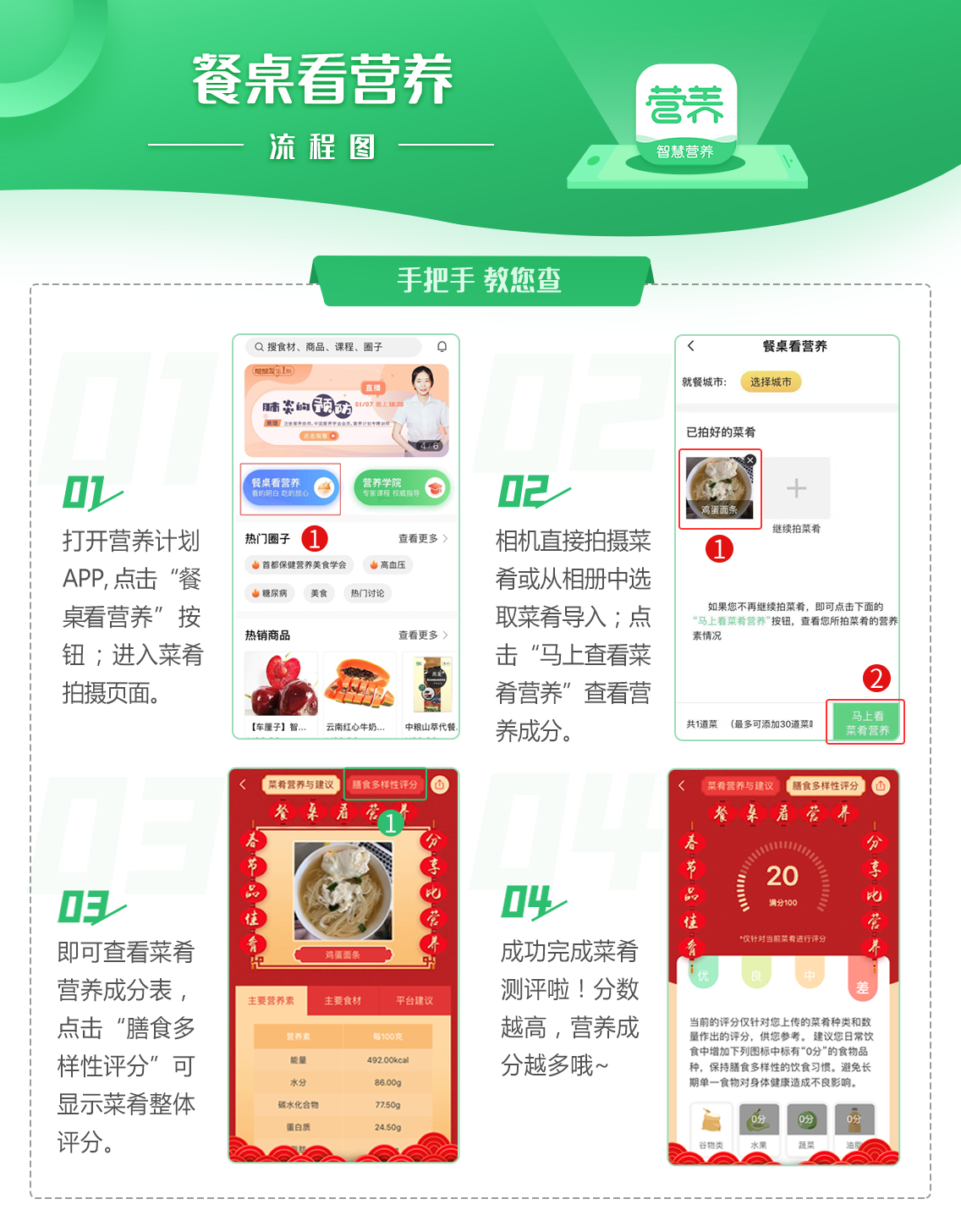 “营养计划App”——“餐桌看营养”功能,只要拍照扫一扫,就能识别餐桌上的菜肴,获取主要营养素和食材信息,得到膳食多样性评分。